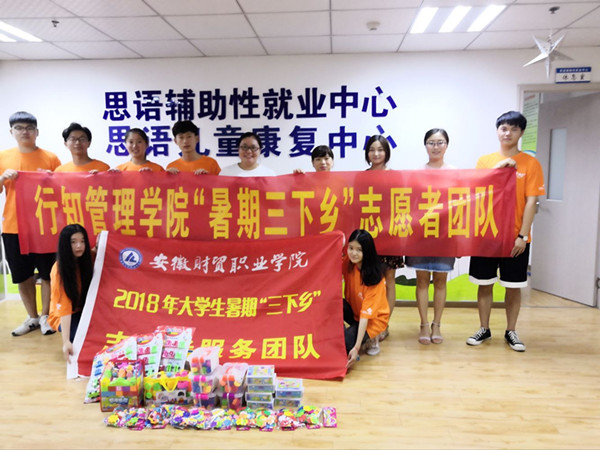 7月2日,行知管理学院暑期“三下乡”志愿者团队以“关爱自闭症儿童,奉献社会”为口号,8位团学干部在团总支书记左艳琼和学生管理秘书蔡玉菊两位老师的带领下来到了合肥市思语儿童康复中心,志愿者团队给思语康复中心的老师和孩子们送去了价值600元的教学用品。此次活动为期8天,志愿者们每天配合思语康复中心的老师们完成当天的教学任务,带领孩子们做游戏,帮助康复中心工作人员完成清洁等工作。
