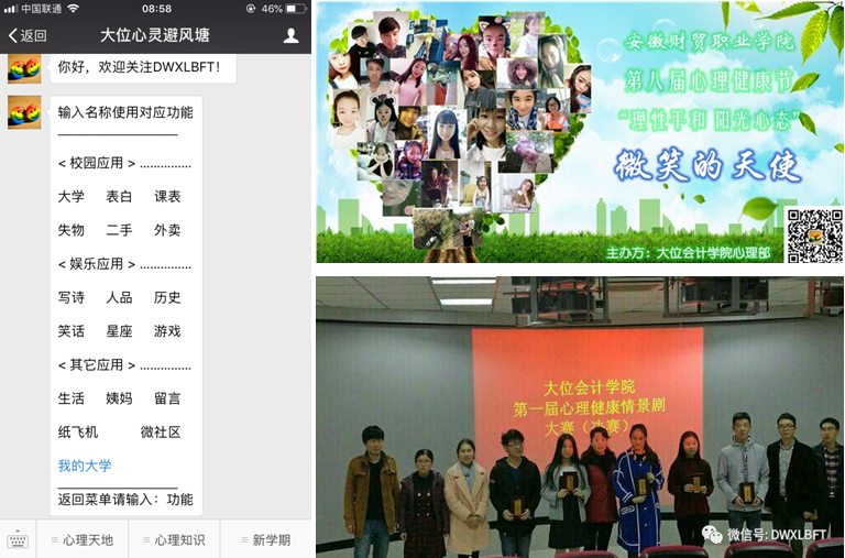 讲座、主题班会、班级活动、口语训练、网络平台、谈心谈话等是高校育人的丰富载体,大位会计学院专职辅导员们利用各种载体,各显神通,开展了一系列的心理健康教育工作。马兰燕老师从学生身心成长规律出发,开展“恋爱中的责任之性教育”讲座,反响热烈;刘凯老师创建“大位心灵避风塘”微信公众号服务学生,组织大位新生班级以“心理健康社会和谐”为主题开展口语训练,主动开展校园心情景剧大赛,并指导大位心理部开展了诸多心理健康活动(如孤独症儿童志愿服务、笑脸征集、手抄报比赛、心理演讲比赛等),既支撑了校心理健康节系列活动,也为大位学子呈现了丰富的心理盛宴;任正盼老师召开挫折教育主题班会,对学生进行团体辅导,引导学生以正确的心态对待挫折,战胜挫折;王繁老师带领学生开展“凝心聚力、共建班集体”班级活动,阐明集体意识与沟通交往的内涵;何小兰、周安琪、齐杰、刘夏、陈雪老师在学生的学业、人际关系、择业就业、生涯规划、理想信念等方面均做了相关工作,这些都是大学生心理健康教育的重要内容。各位专职辅导员始终将谈心谈话作为关爱学生、引导学生、深入开展个体心理健康教育的重要手段,帮助学生解决实际困难。