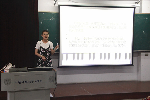 近日,宾虹艺术学院第七期翡翠艺术大讲堂第三讲邀请了行知管理学院办公室主任郭清老师作主题为“走进音乐之‘声’”的知识讲座,宾虹艺术学院2016级、2017级共计150多人聆听了此次讲座。
