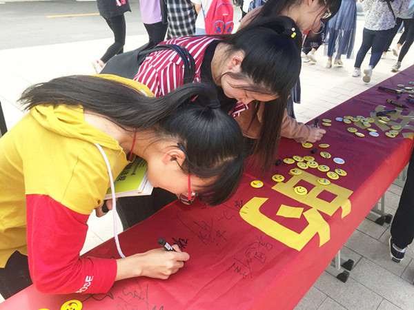 心理咨询老师和心协志愿者向同学们介绍了“世界微笑日”的来历及意义,同学们纷纷在“你的微笑,我的幸福”宣传横幅上签名。为活跃氛围,心协同学特地扮成一只可爱的小熊逗得大家开心欢笑,并赠送笑脸小徽章,呼吁同学们用微笑传递友谊,用微笑传播文明。