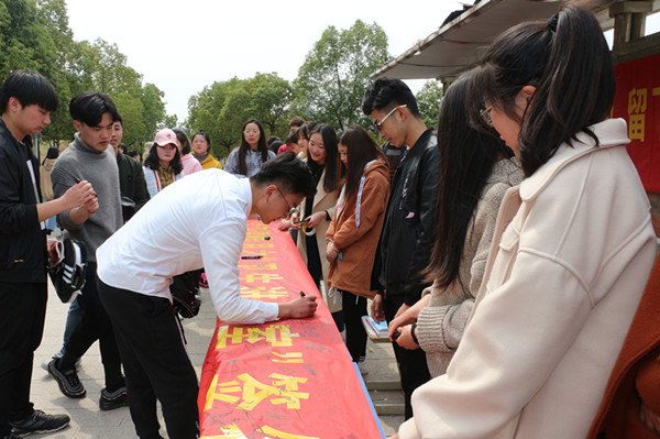 在“学习雷锋精神之文明进教室签字活动”中,同学们纷纷在横幅上签上自己的名字,并表示作为大学生要爱护教室,不乱扔垃圾,随手把教室里的垃圾带走,尊重保洁员的劳动成果,为建造文明校园而努力。