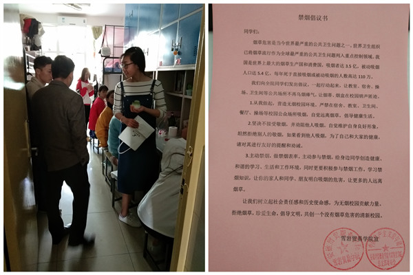 烟草危害是当今世界最严重的公共卫生问题之一。3月23日,雪岩贸易学院向全体同学发起倡议,鼓励大家积极参与到禁烟行动中去,并配合公寓管理中心的管理人员对吸烟的同学进行劝导和教育,让广大同学认识到吸烟的危害和禁烟的意义。