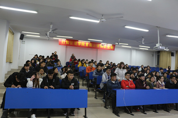 十九大报告提出,明确全面推进依法治国总目标是建设中国特色社会主义法治体系、建设社会主义法治国家。必备的法律素养,是当代大学生立足社会的基本条件。12月19日晚,行知管理学院团总支举办了首届大学生法律知识竞赛,行知管理学院左艳琼、蔡玉菊等5位老师和200余名学生代表观看了本次比赛。