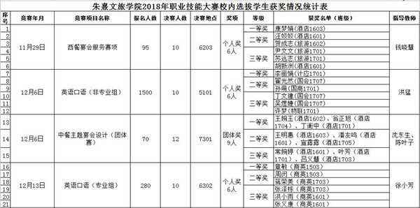 赛前朱熹文旅学院各专业教研室按照2018年职业院校技能大赛赛项分别组建了指导教师团队,校内选拔赛后,指导教师团队从获奖选手中甄选了备赛选手,积极备战2018年安徽省职业院校技能大赛。此次校内选拔赛,是一次很好的大赛演练,既锻炼了实践操作能力,又起到了以赛促学和以赛促教的效果。(供稿:尹悦 审稿:钟晓鹏)