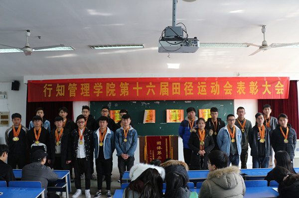 第十六届校园运动会中,行知管理学院获得男甲第二名、女甲第二名、男乙第三名、女乙第二名以及团体第二名的好成绩。会议宣读了优秀运动名单,老师们为优秀运动员和班级颁发了荣誉证书,为全体运动员颁发了奖牌和奖金。