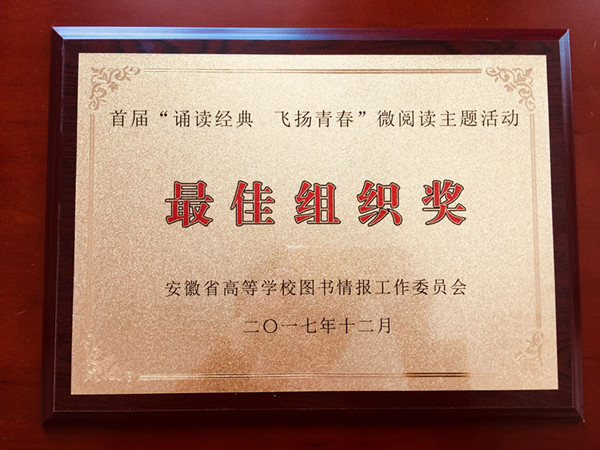 12月8日下午,由安徽省高等学校图书情报工作委员会主办、安徽省各高校图书馆协办、“e博在线”承办的首届“诵读经典,飞扬青春”微阅读主题活动颁奖典礼在安徽农业大学活动中心举办。历时两个多月、全省高校共计2000多份朗诵作品,由微信端线上传送作品,经由安徽人民广播电台和安徽省广播职业学院专家评审。最终,我校会计1711班裴苏慧同学凭借其良好的诵读表现和对诗歌情感的充分演绎,获得了三等奖。学校图书馆获最佳组织奖。