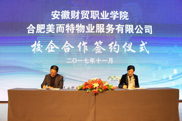 近日,学校与合肥美而特物业服务有限公司举行了校企合作签约仪式。行知管理学院院长黄诗义、副院长刘大俊、房产教研室主任刘春胜,美而特物业服务有限公司董事长常征女士,各项目经理及全体员工出席会议。安徽省立医院副院长傅先民、合肥市房地产管理局物业管理处刘庆梅处长作为特约嘉宾为双方授牌并致辞。会议由美而特人事经理盛新炜主持。