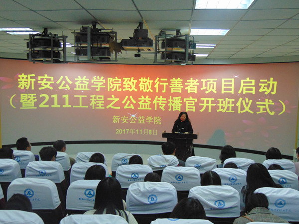 启动仪式上,宋凌云对饱含激情、勇于创新、兢兢业业、忠于奉献的公益志愿者表示充分的肯定与赞扬,在致辞中阐释了新安公益学院“致敬行善者”项目开展的意义,讲述了“211工程之公益传播官”班级开设的组织形式活动方案。积极倡导当代大学生树立爱心意识,服务他人,奉献社会,勉励广大青年志愿者“聚是一团火,散是满天星”,用热情、爱心行动去引领、带动、感染身边的同学,进一步践行社会主义核心价值观,积极投入公益事业,将公益落实在行动上,为公益事业献策献力。刘葆宣布新安公益学院“致敬行善者项目”正式启动。