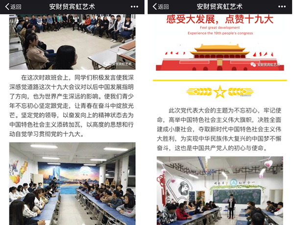 宾虹艺术学院团总支安排各班级于11月初开展“感受党的十九大,点赞大发展”主题教育班会,班级团支书和班长在班会中带领班级同学讨论党的十九大的主要内容,动漫1701班团支书代真玉说,应当拥护党的政策方针,为中国梦的实现矢志不渝,坚定不移。作为安财贸青年学子,我们要积极学习贯彻党的十九大精神,广泛凝聚共识,积极践行社会主义核心价值观,既有爱国爱群之公德,又有服务社会之能力,肩负社会责任和历史使命,以青春、昂扬的姿态迎接新时代的到来。