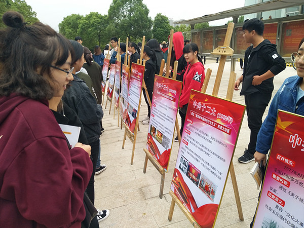 大位会计学院党总支及中特会成员带领在横幅上签名的师生参观并学习中共一大到十八大简史的展板。从96年前拥有几十个党员到如今拥有8900多万党员的世界第一大执政党,我们为党的队伍不断扩大感到骄傲。改革开放以来,党的历次代表大会报告中都有一个醒目的关键词:中国特色社会主义。为此,我们坚信这样一种信念:中国特色社会主义是当代中国发展进步的根本方向,只有新时代中国特色社会主义才能富强中国。