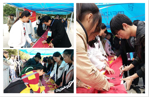 横幅签名活动是在食堂东门举办“喜迎十九大,不忘初心跟党走”的横幅签名活动,老师和同学们都积极的在横幅上写上对祖国的祝福,表达内心的无比喜悦与自豪,让我们共同祝愿我们的祖国更加的繁荣富强!