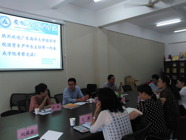 调研交流会上,高尔定对广东海洋大学经济学院国际经济贸易系的来访表示感谢,希望日后深化合作,互相交流进步。尹年长和马诗琴交流了国际经济与贸易专业和学科建设的现状和经验,就本科层次与专科层次国际经济与贸易专业人才不同的培养方案和培养模式进行了深入讨论,并就应用经济类专业实验和实训课程交换了双方的教学经验。尹萌与王潇交流了在职教师参加企业工作,并将一线工作经验传授给学生的实例。也就当下学生的特点和国际贸易发展讨论了校企合作办学的做法。