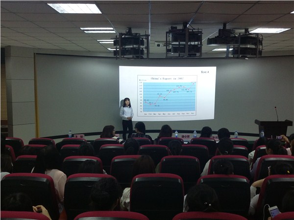 英语口语(专业组)技能比赛只面向商务英语专业同学,2015、2016级在校生可以报名参赛。由于报名人数较多,比赛之前进行了初赛遴选。比赛设置了职场描述和情景交流两个环节组成。职场描述部分,参赛者随机抽取一幅反映行业、企业业务发展或社会、经济等热点问题的统计图表或图片,根据相关说明,用英语对其进行口头描述和观点阐述。情景交流部分,参赛者随机抽取某一场景题目,根据题目设定的角色,与主试官进行一对一的英语现场问答交流,展现参赛者的情景应变能力和口语交流能力。