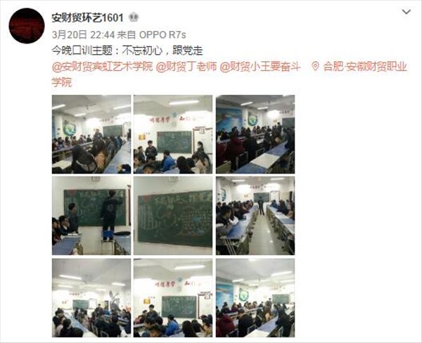 引导学生自我教育。3月18日至23日,2016级各班级利用每晚的口语训练以“不忘初心跟党走”、 “怎样做一名合格团员”等主题开展团日活动,加强团员的政治理论修养。在3月22日晚的时政学习中,2016级各班级又开展一次专题的社会主义核心价值观学习交流,分享社会主义核心价值观在当今社会中的主流价值观的引领。