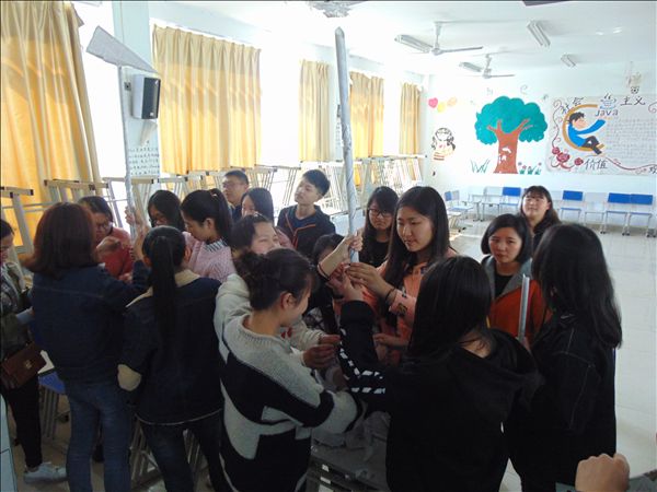 在朱熹文旅学院团总支副书记张妞的组织下,参训同学分成3个小队,每一小队“民主”选举出队长,确定队名“快乐家族队”、“天天向上队”、“团结至上队”。三个队伍合作完成了“运筹帷幄,共建高楼”、“传话筒”、“盲行”、“万里长城”等四个有趣的游戏。令很多同学感受最深刻的是“盲行”活动,一个用眼罩蒙着眼睛的“盲人”,在另外一根“拐杖”的搀扶下,相互依偎前行,“盲人”摸索着前进,而“拐杖”则无微不至地照顾 “盲人”。他们上下楼梯,克服一个又一个障碍,最终圆满完成任务,同学们深刻地体会到了团队的责任和人与人之间的相互信任。