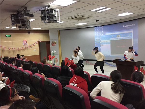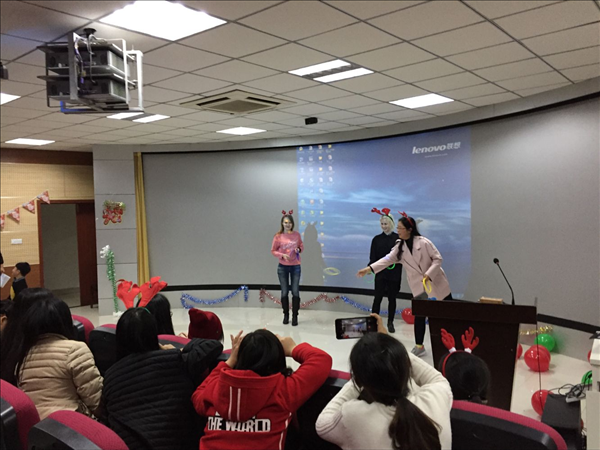 交流活动中,同学们和外教老师们一起戴圣诞帽,吹气球,挂彩带,派送糖果等。瑞恩(Ryan)用PPT介绍了美国圣诞节的情况及自己与家人过圣诞节时的图片留影。同学们向外教老师们表示了圣诞节祝福,并表演了歌曲、舞蹈、相声等中国传统文化节目。