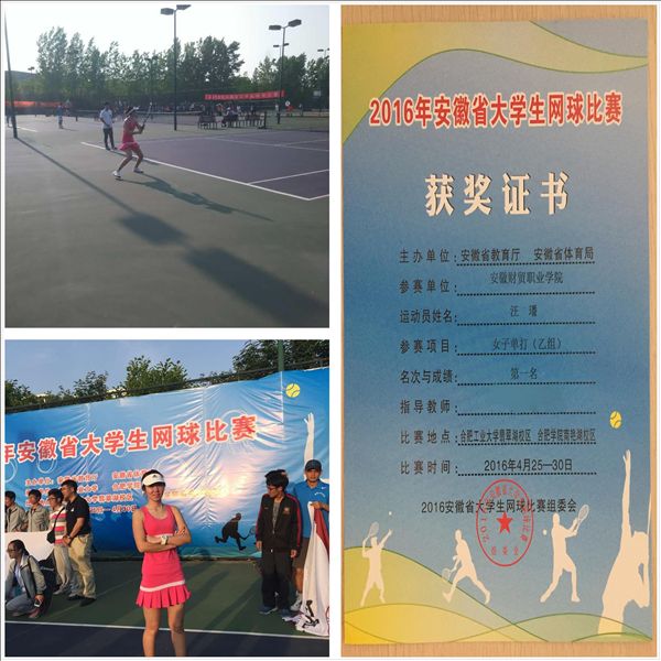 日前,2016年安徽省大学生网球比赛在合肥工业大学翡翠湖校区和合肥学院南艳湖校区举行,我院旅游管理系商英1401班汪璠同学报名参加了乙组女单(高职组)比赛项目并摘得冠军。