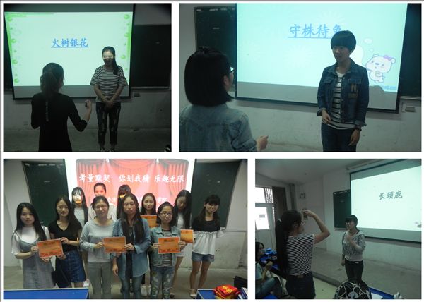 “考量默契 你划我猜”规定两人一组,其中一人根据目标词语进行动作比划和语言引导,另一位同学根据提示猜出目标词语,在规定时间内正确猜出的词语越多,成绩越高。为了增强比赛的知名度,组织方的同学们还自己设计了海报张贴在校内的宣传栏内。比赛中,大位会计学院汤明慧-凌安琪两位同学最有默契,正确完成词语数最多,获得一等奖,财税金融系孙宁-赵雪,雪岩贸易学院陈梦-冯玲丽获得二等奖,行知管理学院李闪闪-蒋秀玉、大位会计学院方欢欢-胡梦迪、大位会计学院金玉南-丁跃丽获得三等奖。
