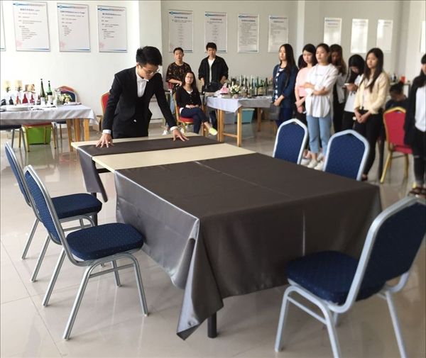 中午,“职业教育体验”活动在酒店实训室举行,酒店1402班朱晟同学向来自各院系的同学们展示了“西餐主题宴会设计”的整个环节与流程,刚从省级大赛凯旋归来的他用自己的职业技能给大家展示了一场精彩的视觉盛宴。