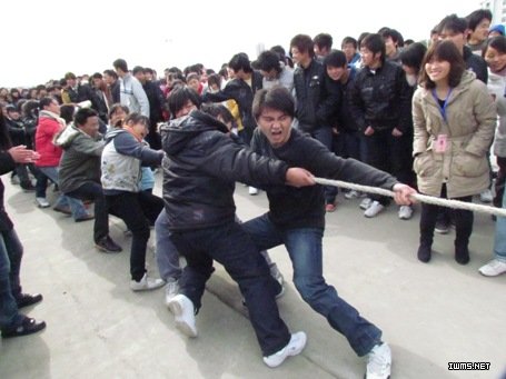 全系11个新生班级各组建一支代表队参加了比赛,每支代表队由10名男生、5名女生组成。赛场上,各参赛代表队喊着响亮整齐的口号,心往一处向,劲往一处使,那根判断胜败的红线在双方的场地中不停拉锯。旁边的拉拉队员们也不含糊,他们一刻不停地为各自的队伍摇旗呐喊。这场精彩的拔河比赛不时引起路过老师和同学们的关注。